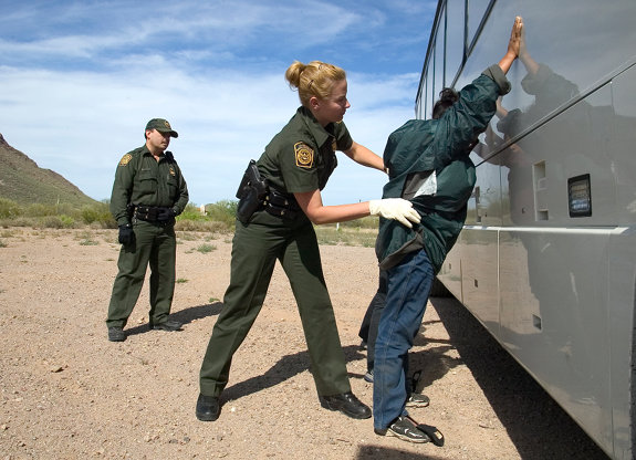 A Customs and Border Patrol agent pats down a woman who will be returned to Mexico. (Photo by Gerald L. Nino.)