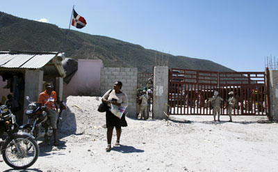 A woman walks into the Dominican Republic after crossing through the gate at the Jimani border crossing. Men with motorcycles wait to take people into town. (Photo by Lauren Gilger.)