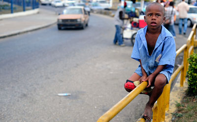 Pedro 'Fifito' Manuel Galbán, 6, sits on a railing at the intersection of San Vincente de Paul St. and Mella Highway in Santo Domingo, Dominican Republic, while taking a break from his daily work cleaning windshields with a squeegee and sponge. (Photo by Brandon Quester.)