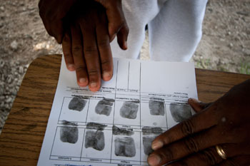 Haitian judicial police fingerprint Wilberle Vereus, a 22-year-old deportee from California, on the morning he was deported to Haiti. (Photo by Jacob Kushner.)