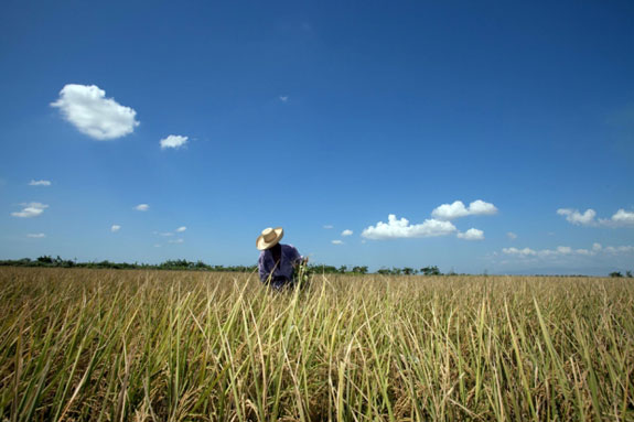 A rice grower weeds his field in the Artibonit Valley. (Photo by Ben Depp.)