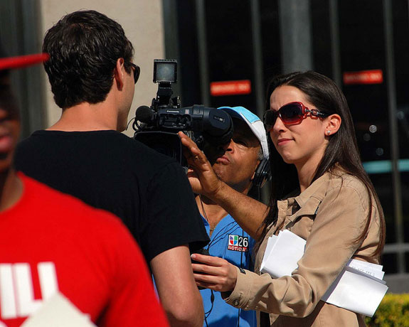 A television news crew interviews a protestor outside the Criminal Justice Building in Sanford on March 19. (Photo: Flickr.)