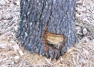 This oak tree, allegedly poisoned by Robert Barnhart, "had signs of dying and chop marks near the base," said a state report. (Photo courtesy of Florida Office of Agricultural Law Enforcement.)