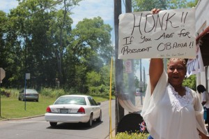 Danita Agee, 53, isn’t shy about which candidate she supports in the November election. AGEE greets drivers during a voter registration drive outside her grandmother’s deli in Pratt City, Ala., just north of Birmingham. (Photo by Khara Persad/News21.)