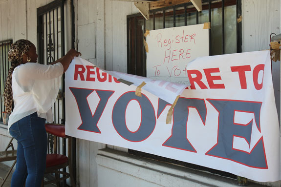 Danita Agee, 53, secures a banner at a voter registration drive she helped organize in Pratt City, Ala. (Photo by Khara Persad/News21.)