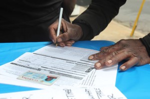 An Alabama resident fills out a voter registration form outside a deli in Pratt City, Ala. The deli is owned by Marie Thomas, and operated by her daughters Debbie and Danita Agee, who organized the registration drive. (Photo by Khara Persad/News21.)