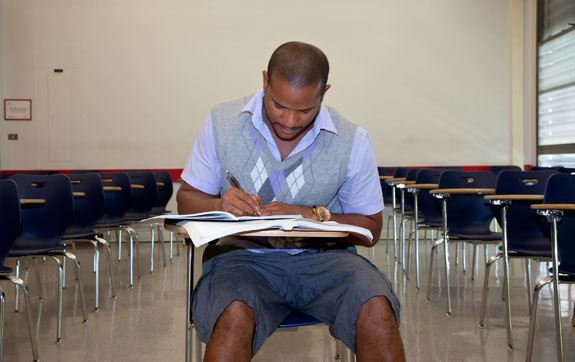 Chad Carroll, 36, needed to take remedial math classes when he enrolled in Miami Dade College. He isn’t alone. For Florida college students age 35 and older, 90 percent must take remedial math courses before they can begin college-level studies. “I didn’t accept it at first, but you have to embrace it,” Carroll said of remedial education. (Photo by Sagette Van Embden.)