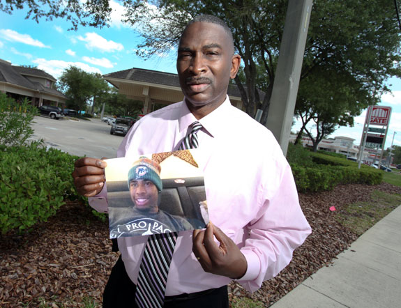 1 Ron Davis sostiene una foto de su hijo de 17 años, Jordan, cerca de la gasolinera donde lo mataron a tiros. (Foto por Walter Coker.)