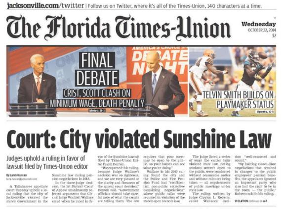 The Florida Times-Union in Jacksonville recently won a legal battle over Sunshine laws. According to the paper, city officials improperly held private meetings regarding pensions.