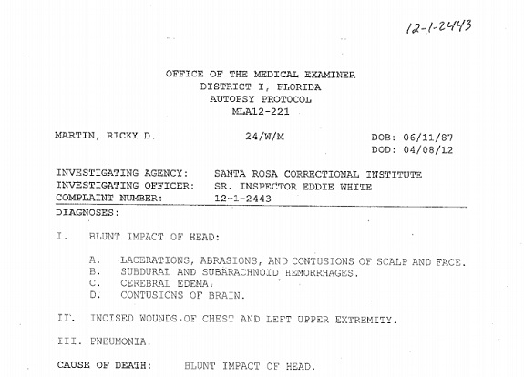 Prison records show that Martin, who was serving a six-year sentence for grand theft and armed burglary, had been at Santa Rosa for about 36 hours before he was found brain dead.