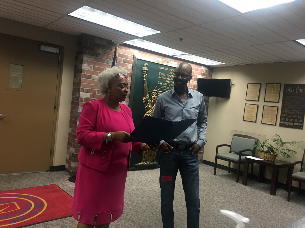 Broward County Supervisor of Elections Brenda Snipes congratulates Roderick Kemp on the executive order reinstating his voting rights.