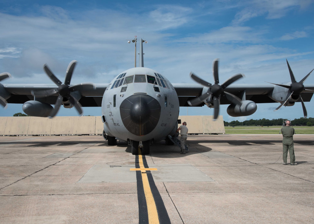 Tech. Sgt. Zahary Zieman, aloadmaster and dropsonde operator for the 53rd Weather Reconnaissance Squadron, assists the aircrew with the engine startup prior to takeoff for a mission into Tropical Storm Chris on July 8. (Photo by U.S. Air Force Maj. Marnee A.C. Losurdo.)