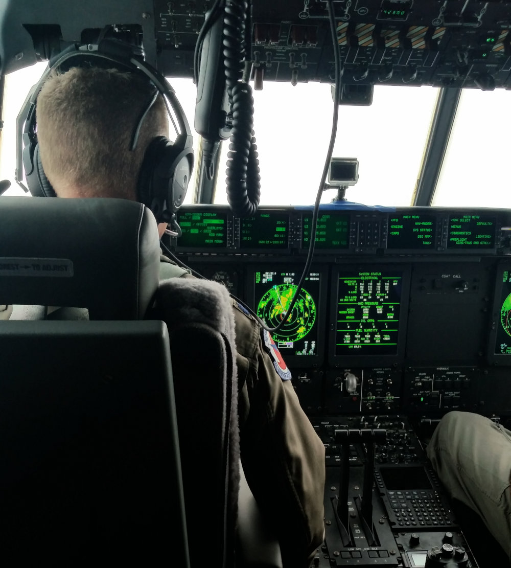 Lt. Col. Sean Cross of the 53rd Weather Reconnaissance Squadron pilots the plane into the eye of Hurricane Michael on October 10. (Photo by Tristram Korten.)