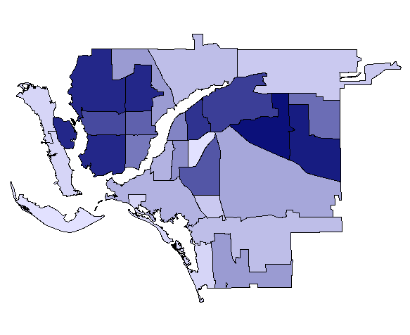 Roll your mouse over each ZIP code to see its calculated foreclosure risk rating. Foreclosure risk ratings are based on the numbers and rates of foreclosures, subprime loans, delinquencies and vacancies. The darker the ZIP code the higher foreclosure needs score.